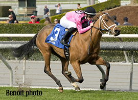BELVOIR BAY (GB) (f, 2, Equiano {Fr})–Path of Peace {GB}, by Rock of Gibraltar {Ire}), last seen finishing ninth in Belmont’s Chelsey Flower S. in her U.S. debut for Bill Mott, looked like a new horse this time around while receiving first-time Lasix and switching to the Peter Miller barn. Two-for-five earlier this season while under the tutelage of Richard Hannon, the bay’s final British start was a close-up fourth in Goodwood’s G3 Prestige S. over seven panels of soft ground Aug. 29. Showing a slow series of drills out west since the trainer change to Miller, Belvoir Bay broke very alertly, but was content to concede pacesetting duties to Sweet Queen (Twirling Candy) through splits of :22.59, :47.04 and 1:11.93. Taking over in the blink of an eye turning for home, she exploded in the stretch, leaving favored GIII Jimmy Durante S. winner Family Meeting (Sky Mesa) with far too much to do from the back of the pack, and streaking home to a seven-length victory in 1:36.15. Sweet Queen held on for third. Lifetime Record: 7-3-1-0.